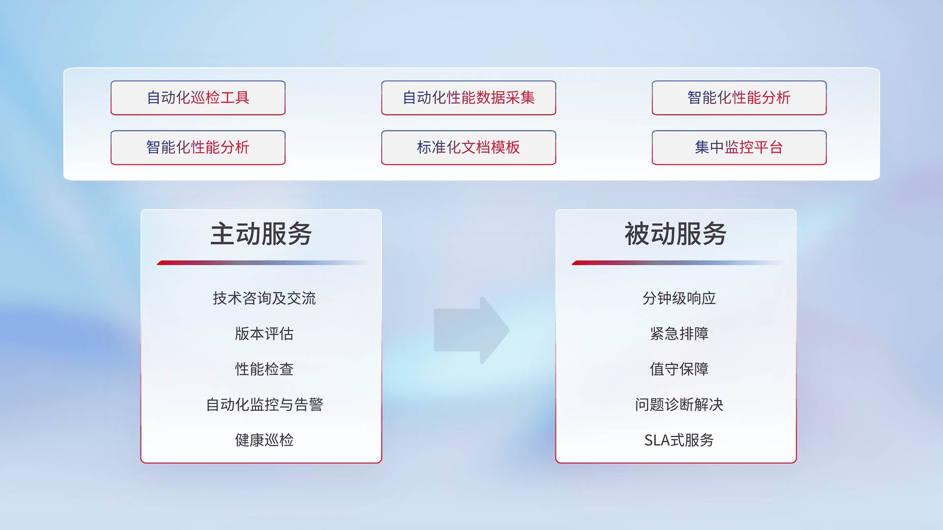 智能化工具和标准化文档,,保障服务质量,,,提供主动服务(包含技术咨询、、、、版本评估、、、性能检查、、自动化监控与告警、、、健康巡检)和被动服务包含(分钟级响应、、紧急排障、、、、值守保障、、问题诊断解决、、、SLA服务)。。